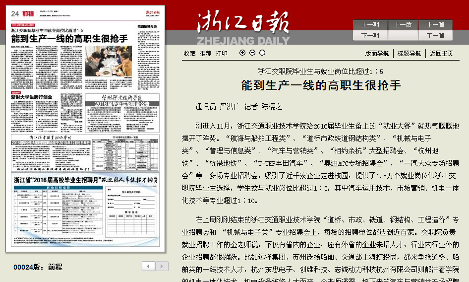 浙江交职院确立“立足交通行业、开辟新型产业、确保岗位需求”的就业市场建设思路,结合行业发展和专业特点,依托全省11个地市校友工作站及行业协会、地方人力机构等社会资源,有力推进“1+3行业”就业市场建设,毕业生广受用人单位欢迎。浙江交通工程建设集团有限公司党委副书记马步进认为“集团公司有很多浙江交职院毕业生,他们有的已成为公司骨干,我院学子肯吃苦、上手快,随着公司海外市场进一步扩展,公司希望我院优秀毕业生能走向海外”。浙江温州红旭集团总裁徐象龙说:“浙江交职院毕业生综合素质高,大局意识强,在企业中沉得住气,发展空间大,很受企业欢迎”。