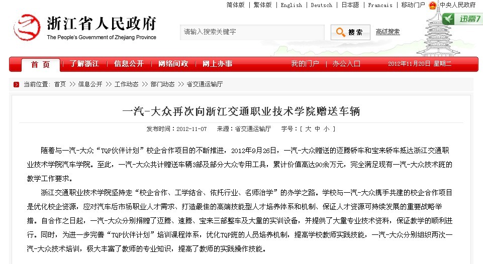 随着与一汽-大众“TQP伙伴计划”校企合作项目的不断推进,2012年9月26日,一汽-大众赠送的迈腾轿车和宝来轿车抵达yl6809永利官网汽车学院。至此,一汽-大众共计赠送车辆3部及部分大众专用工具,累计价值高达90余万元,完全满足现有一汽-大众技术班的教学工作要求。