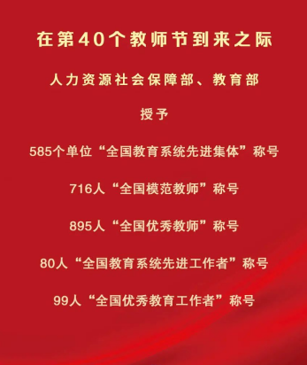 在中华人民共和国成立75周年和第40个教师节到来之际,为大力弘扬教育家精神,营造全社会尊师重教浓厚氛围,激励全国广大教师和教育工作者落实立德树人根本任务,积极投身教育强国建设,人力资源和社会保障部、教育部对全国教育系统先进集体、先进个人进行表彰。
