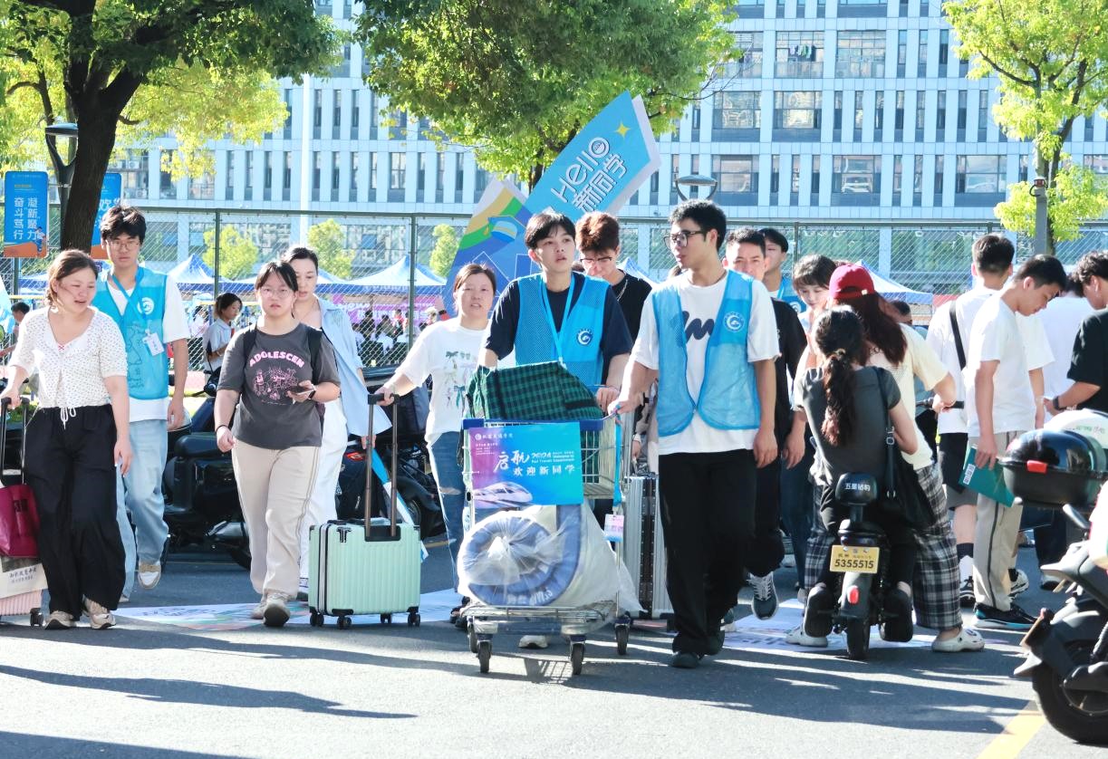 在新生报到点,新生们通过人脸识别系统,线上“刷脸”即可完成身份核验,报到流程更加高效快捷。为了方便新生入校,分院安排了身穿蓝色马甲的学生志愿者,专门提供“一站式”志愿服务,有条不紊地协助新生报到注册,并用提前准备好的30辆“轨道小火车”(手推车)帮助新生搬运行李,用实际行动诠释责任与担当,成为了校园里一道亮丽的风景线。